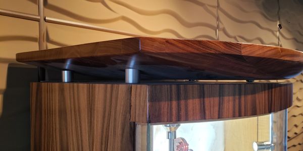 Hand-cut, beveled Brazilian Rosewood floating top rests on stand-offs in the signature style of George Nakashima