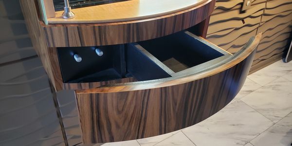 Easy storage for tuners, strings, metronome. Includes hidden light controls for spotlights and silhouetting background